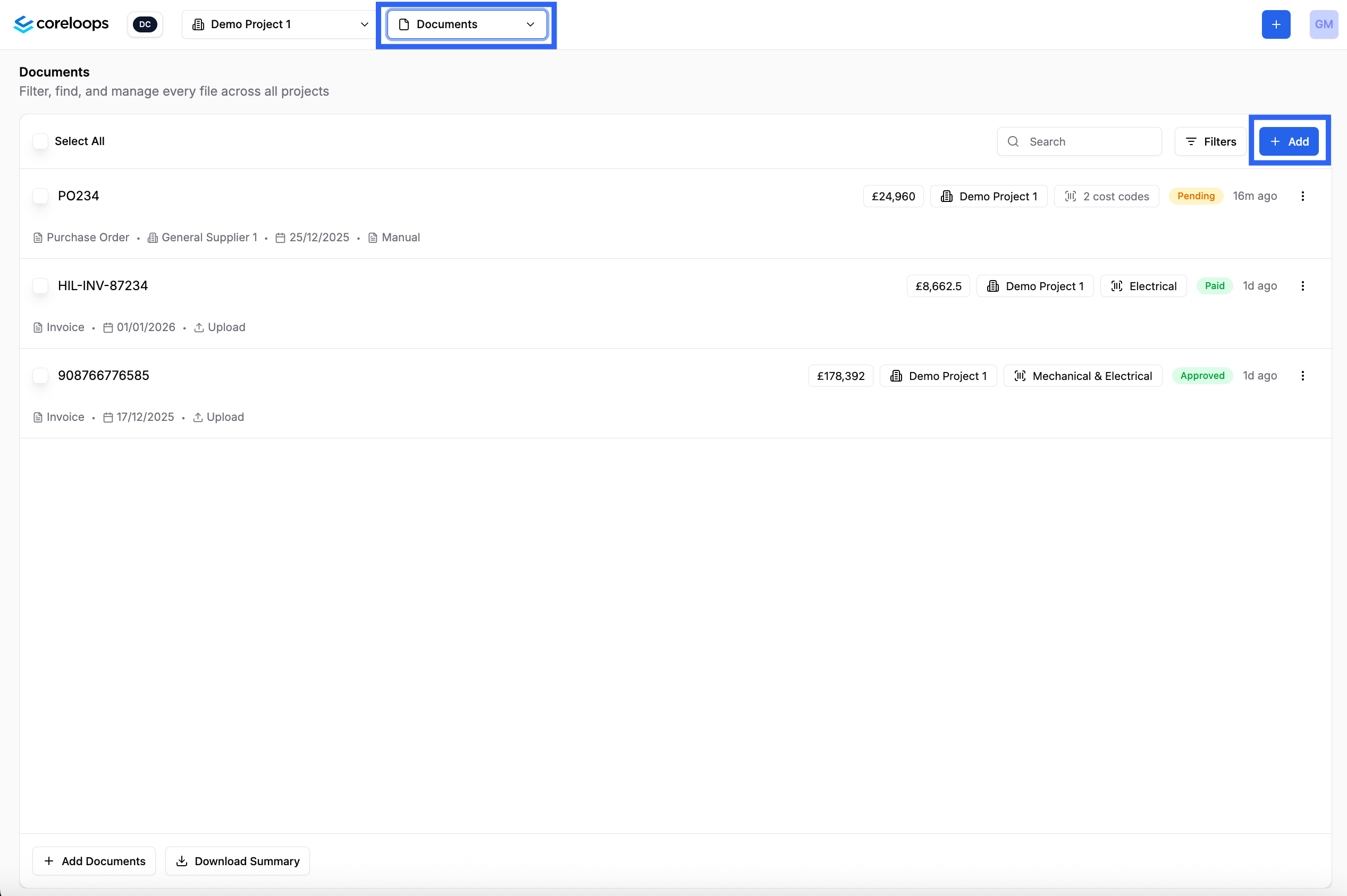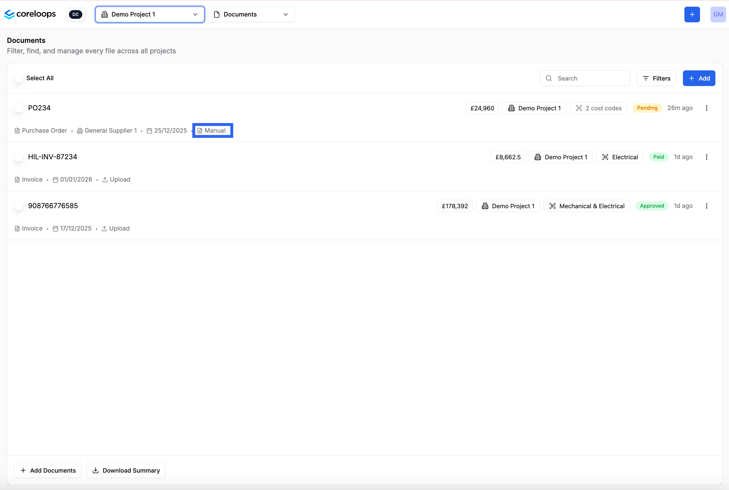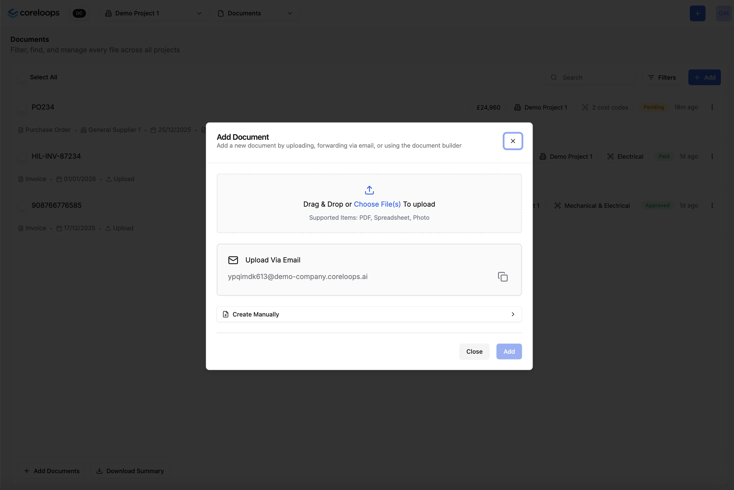 You can upload any type of purchase document into Coreloops including quotes, purchase orders, invoices and receipts. Coreloops will automatically process all the information in the document, including construction-specific fields such as retention, CIS deductions, etc. The document is then automatically categorised to a specific project and cost codes.