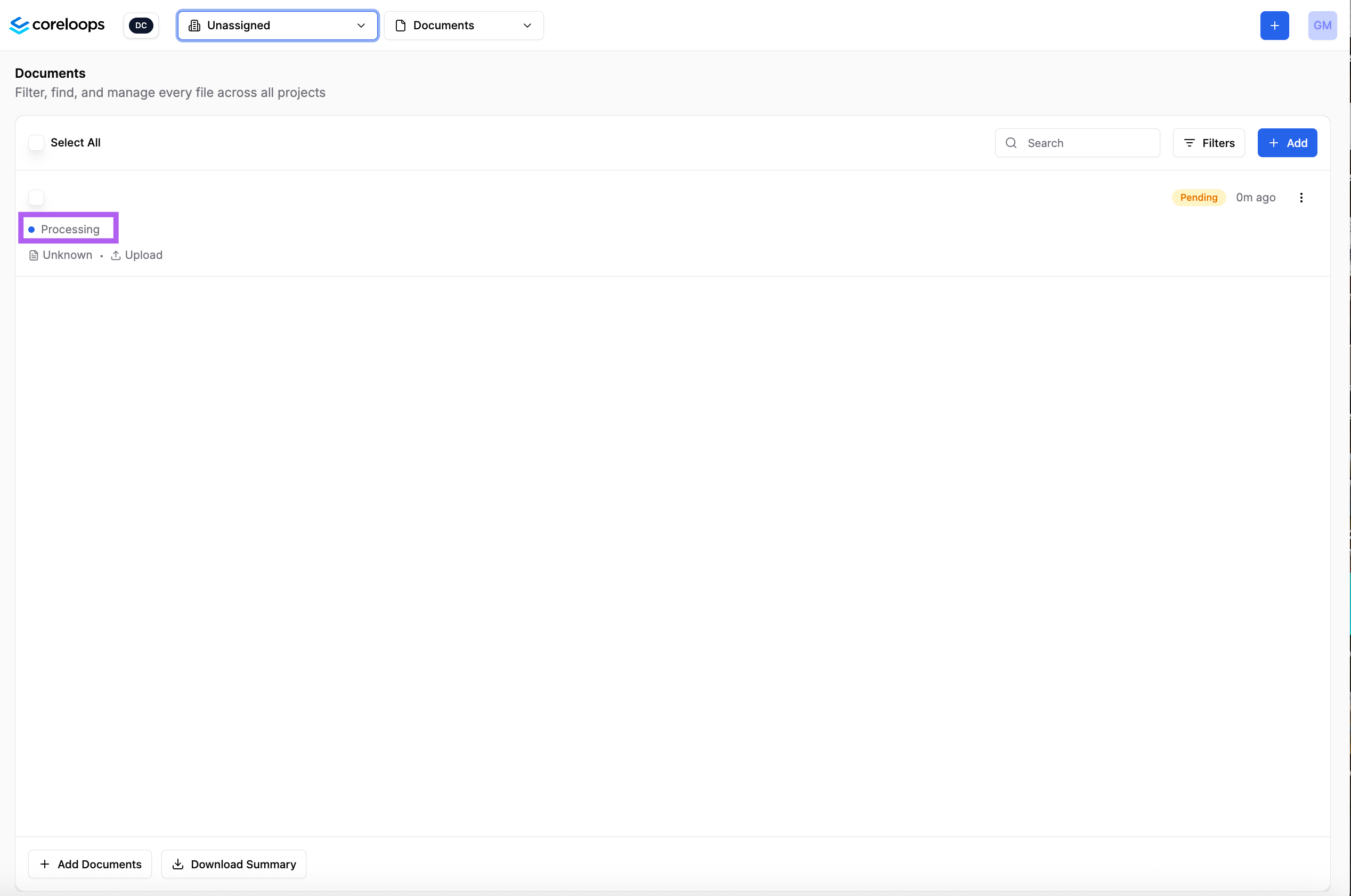 - Once uploaded you'll see the document status will show up as processing. The system takes between 1 - 5 minutes to process a document so go grab a coffee and come back in a few minutes.