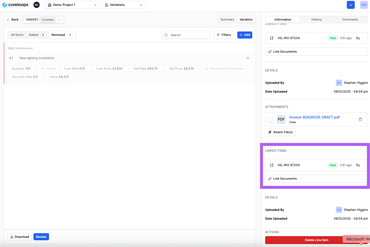 You can link existing files you've already created or processed in Coreloops, such as quotes, purchase orders and invoices, to a specific variation order line item. This will enable you to use values such as the sum of all quotes to estimate how much this should cost to deliver this variation.