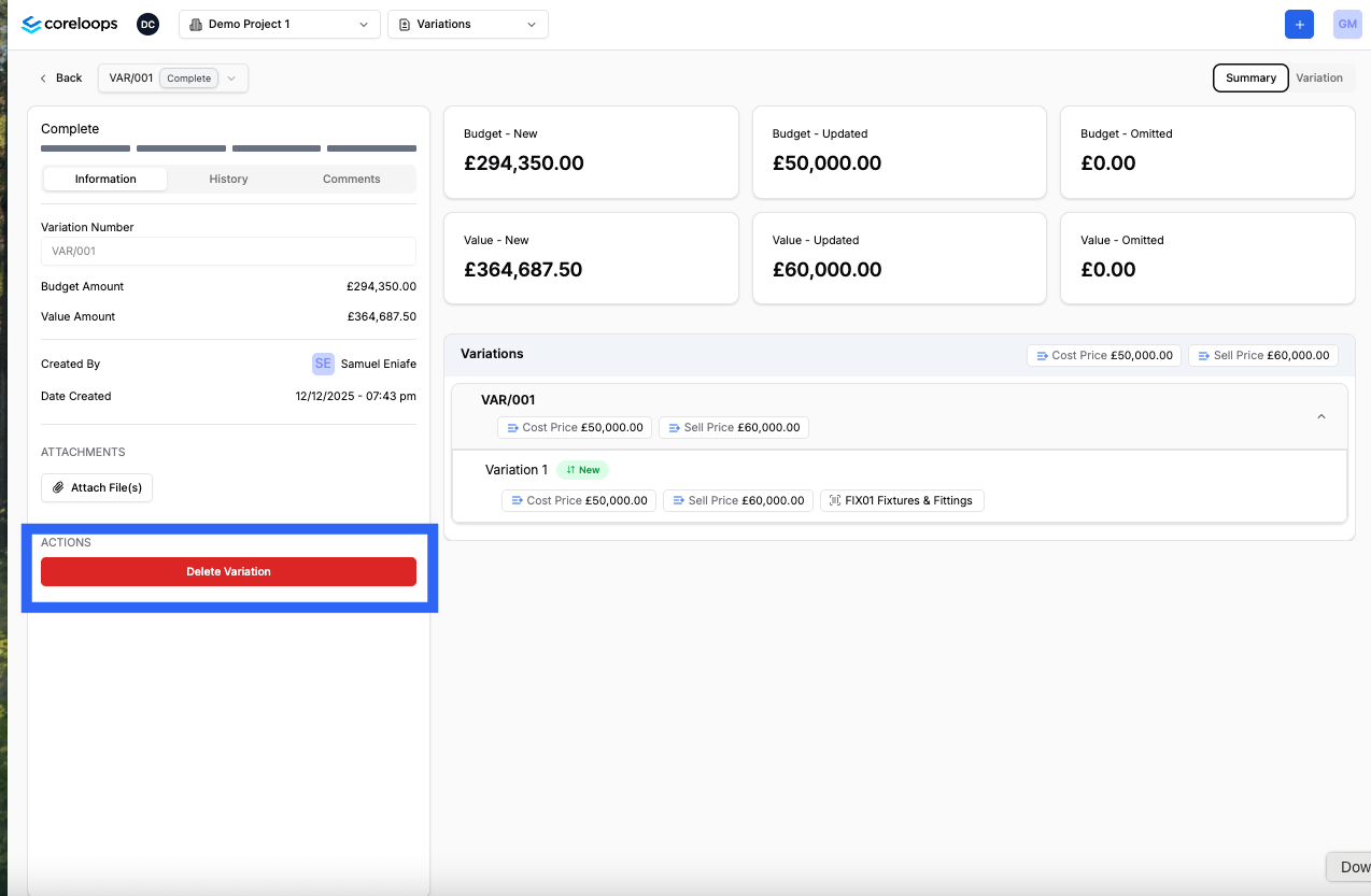 Once you're ready to delete a variation order, you can delete it by navigating to the summary tab and then clicking on delte variation order. This will delete the variation order from your BOQ and pending payment applications where it hasn't been applied for.