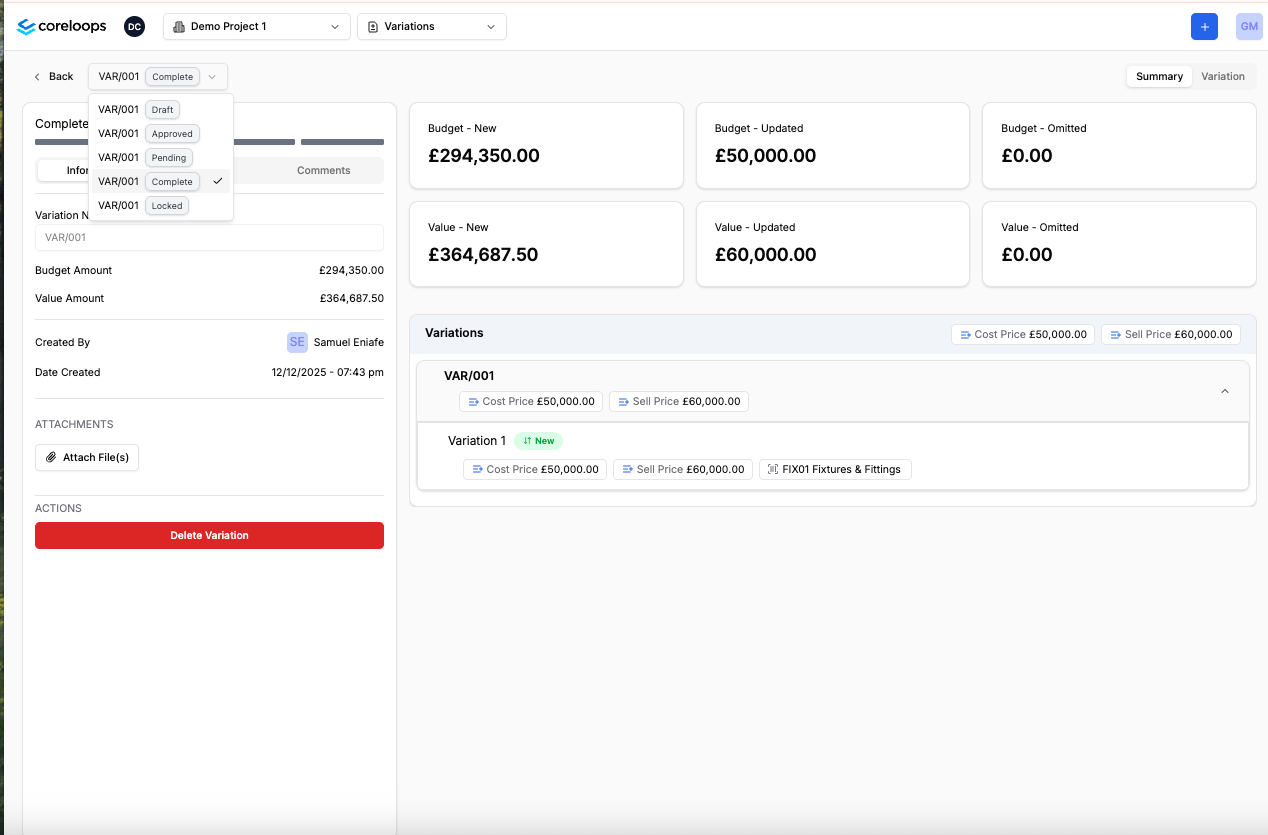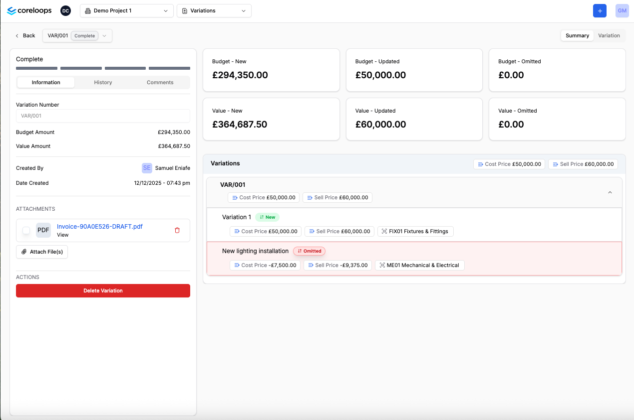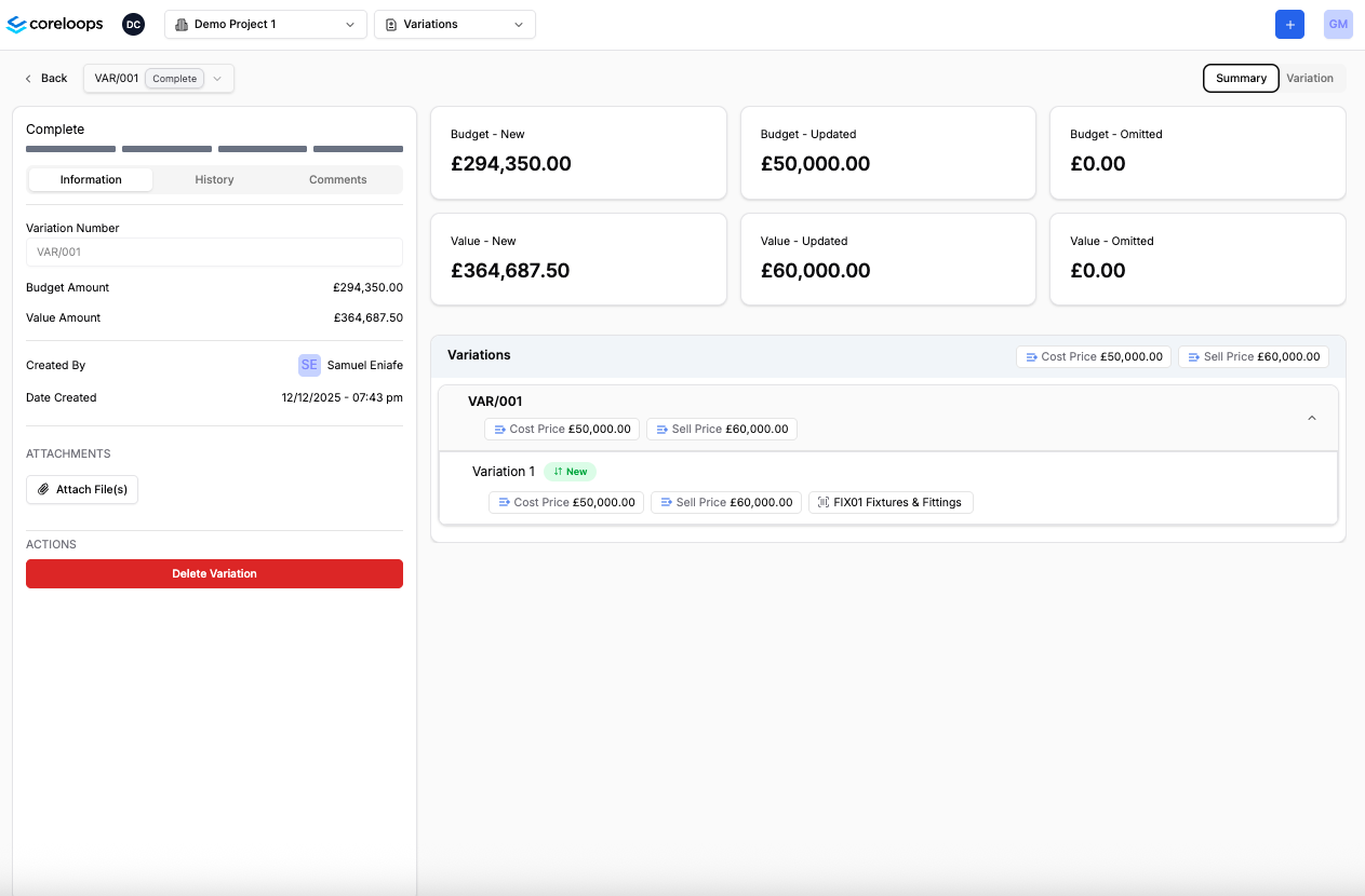 You can review a summary of the variation order and hwo it will impact your project by clicking into the "Summary" tab.