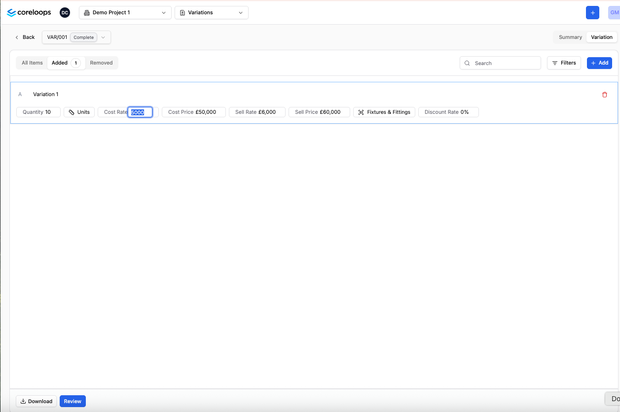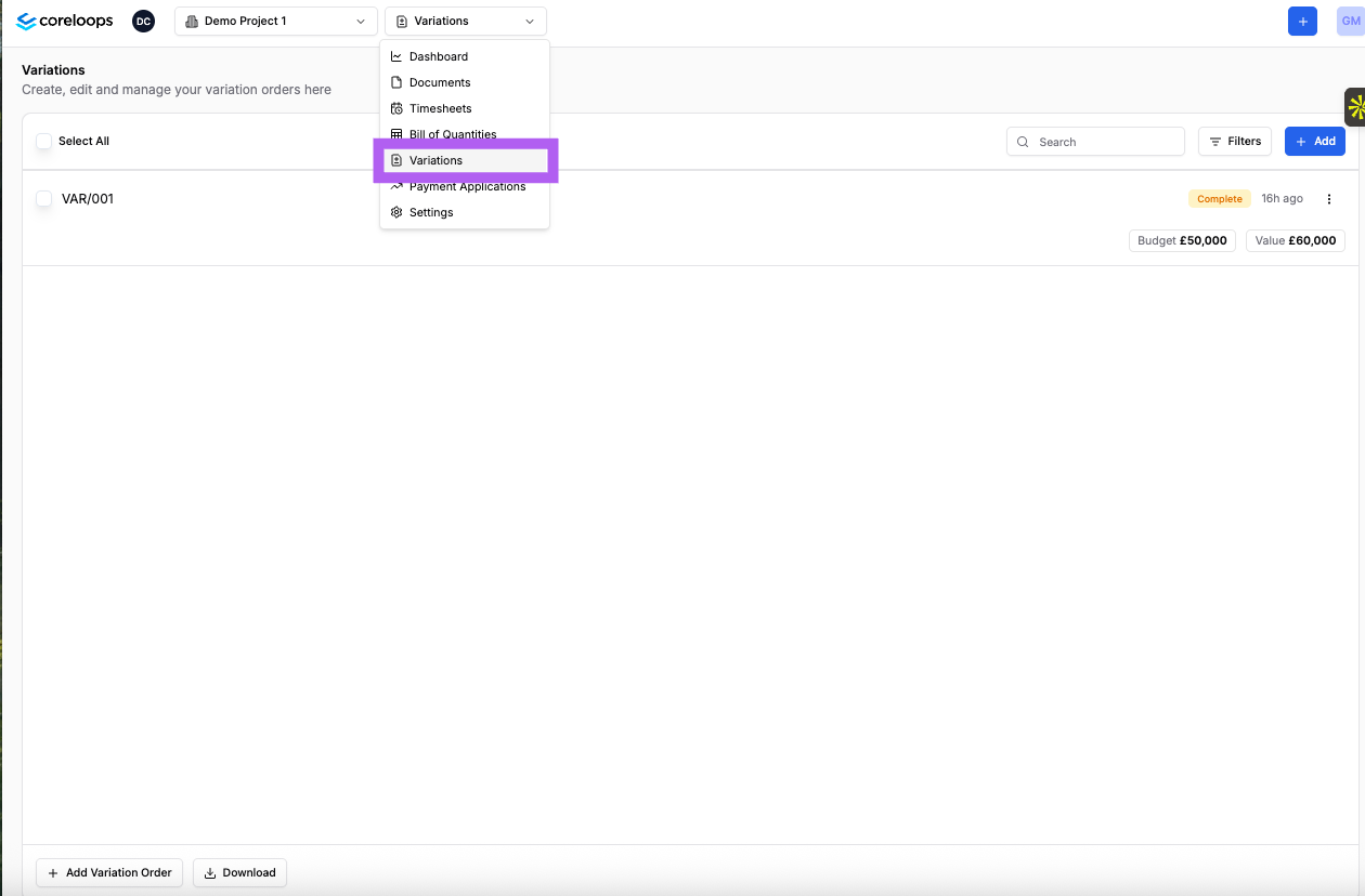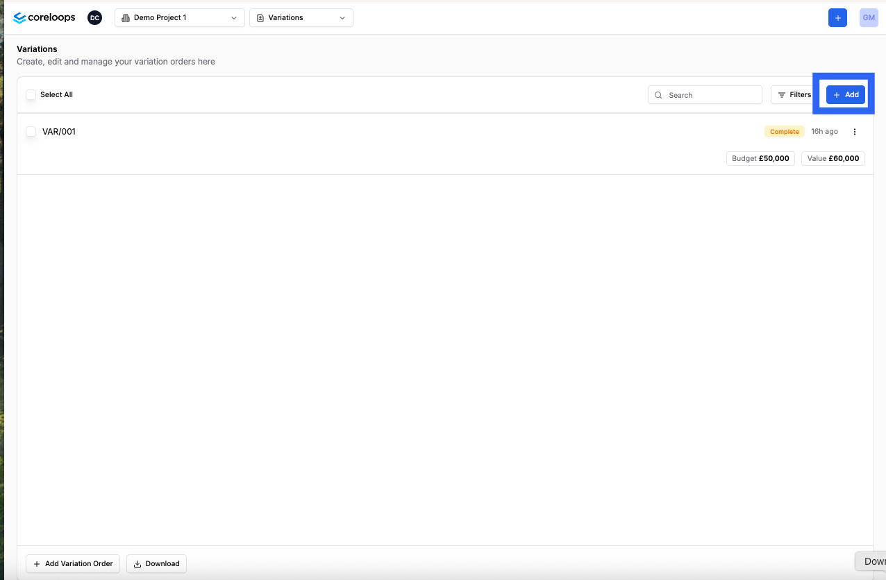 You can add a new variation order by clicking "Add" in the right-hand corner of the variations table. This will create your next vairation order