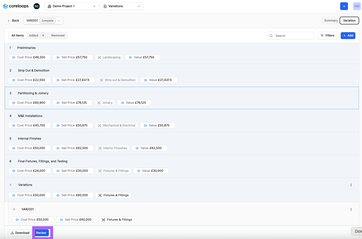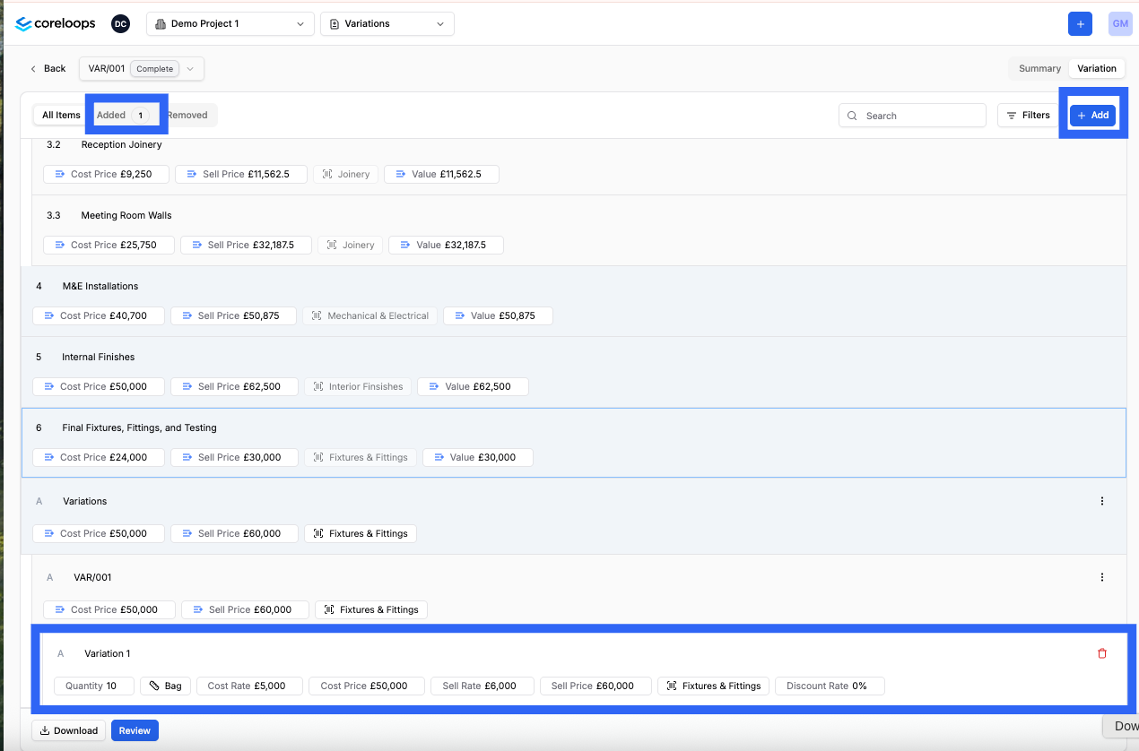 You can add new items to this variation order by clicking on the add item button to the right. A line item will be created under the variation order sub-section. You can also access all added items in the "Added" tab.