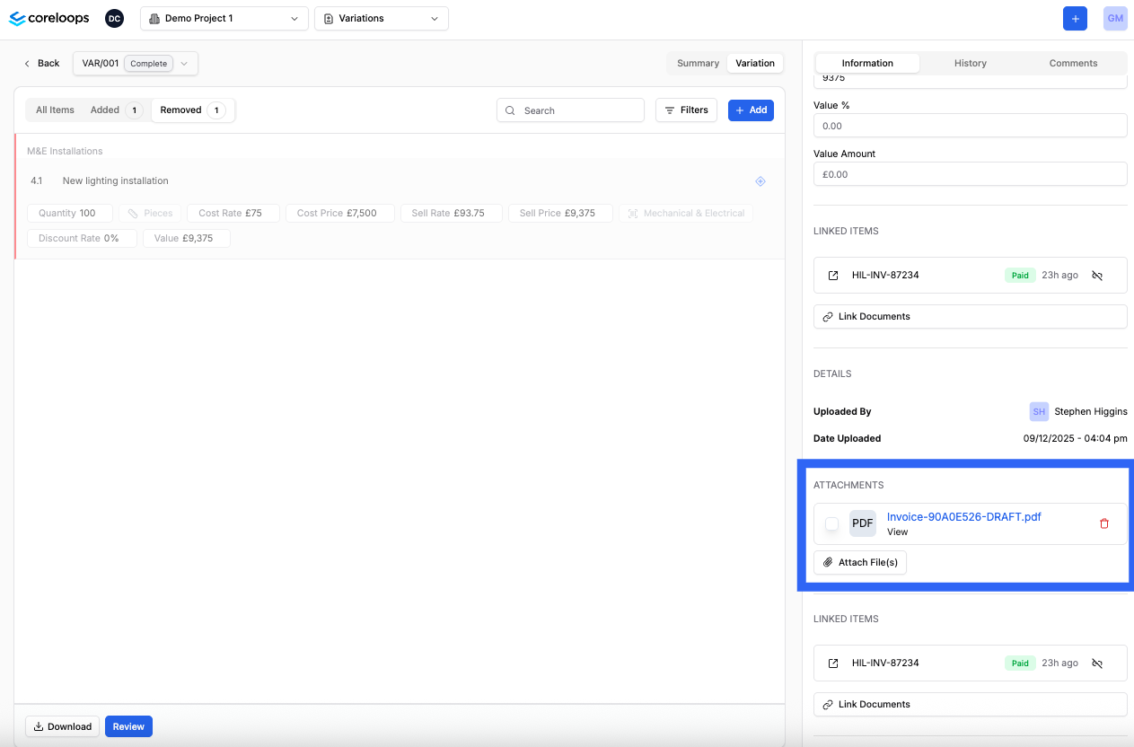 This attachment will appear in the variation order PDF, clearly labelled against the line item.